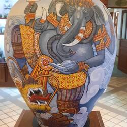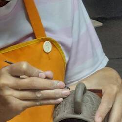 Das Angebot entlang der Straße von Sankampaeng reicht von Lederwaren, Möbeln, mit lackiertem Reispapier bespannten Bambusschirmen über Seide und Celadon, und bestimmt habe ich noch eine Menge vergessen. Überall kann man die Herstellung der jeweiligen Produkte beobachten und natürlich anschließend auch kaufen, davon lebt das Modell schließlich! Durch unsere vorherigen Aufenthalte kennen wir natürlich vieles schon und haben dieses Mal bewusst auf Lederwaren, Celadon und Seide beschränkt. Gerade beim Celadon haben wir einiges Hübsche gefunden und erstanden. Dank unserer Adresse in Bangkok wird uns nun ein Päckchen geschickt, und wir brauchen uns nicht bruchgefährdet per Flieger damit abzuschleppen.