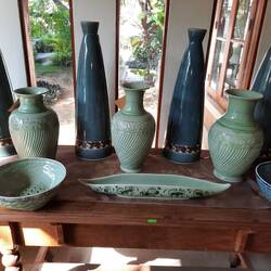 Ende des 13. Jahrhunderts wurde diese Form der Keramikherstellung in den Süden nach Thailand exportiert, als König Ramkhamhaeng von Sukhothai selbst die einschlägigen Techniken von einer Reise nach China mitbrachte. Die Keramikindustrie von Sukhothai und Sawankhalok hat sich in Si Satchanalai bis heute erhalten. Auch die Glasuren zeitgenössischer westlicher Keramiker zeigen gern die Farbe von Celadon.