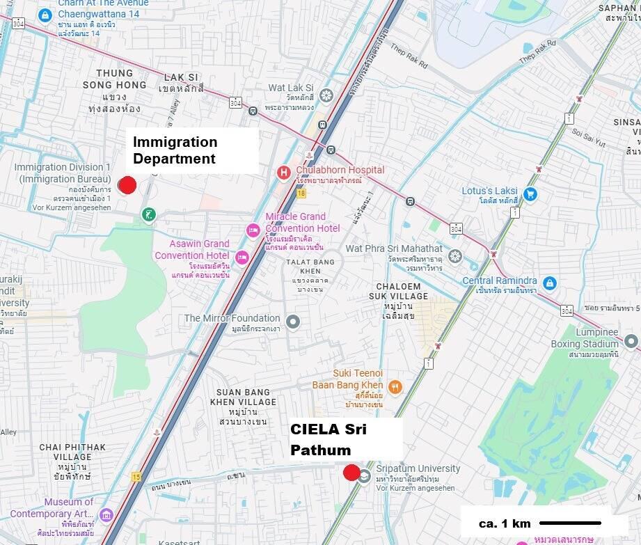 Alle Jahre wieder……...müssen wir zwecks Verlängerung unserer Aufenthaltserlaubnis zur Einwanderungsbehörde im Großkomplex an der Chaengwattana-Road. Auf der beigefügten Karte kann man sehen, daß das betreffende Gebäude gar nicht so weit von unserer Wohnlage entfernt ist.