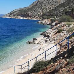 After our coffee and breakfast in the cockpit listening to the marina waking up: birds chirping and flapping, people chatting, and tools whirring, we set off towards Lefkada. We had sailed there last year. We took the old road through the country and up, up then down along the salt marsh where we saw a flock of flamingos so Bob quickly turned off on a dirt path. We walked across a wooden bridge to the outer beach then drove back onto the main road and across the lift bridge we'd had to wait for last year, twice! Easy peasy this year! We drove the sea side around to the town then parked and got our bikes out and rode through and around the Levkas. There is a massive marina and there are lovely pedestrian streets and alleys, churches, shops and restaurants. After lunch, we set off down the coast along the channel we'd cruised last year. Dipped my toes then drove to the other side of the island driving up into the mountains and down to the fabulous Pefkoulia beach. The roads are full of S bends and even sharp switchbacks with not much turning room, especially with oncoming traffic. There are lots of rock falls with either netting or barriers at the bottom of the cliffs but still somewhat alarming. The drivers are fast but not crazy and they are patient with the slower pokes! Bob has done very well with the standard shift even on the tight mountain corners. I'm not quite as white knuckled as last year in the mountains of Albania when Bob didn't know how to reverse!