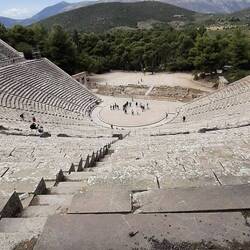 We decided to get things from the car- swimsuits, books and head to the beach. When we arrived at the car, we realized 2 cars beside had somehow gotten out so now it was our turn to negotiate! The market people turned out to be helpful moving bins, and hanging clothes and directing Bob through the narrow passage forward, reversing and turning while I walked in front clearing things and people! When we got out, I felt liberated! Bob did an amazing job with the standard shift saying he wouldn't have been able to do it on the first days with the car! All the switchbacks and tight corners paid off! Since it was early afternoon, we checked into the hotel in Tolo and went off to Epidaurus which has the ancient healing centre and an amphitheatre that is still used today! Fantastic acoustics and in ancient times could seat 14000 in and around! Disappointing archeological site though as it's overgrown and has scaffolding to repair but the theatre was worth it.