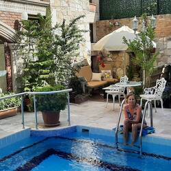 We left Izmir and traveled by train arriving in Selcuk after 1.5 hours. Storks nest on every available Greek/Roman column! We had a short walk to the hotel situated below the castle but on a street that had families, cats, tractors, and a small shop; somewhat run down and I thought we couldn't be in the right place but came upon the small hotel, a beautiful oasis! Gorgeous flowers, welcoming hosts, a beautiful blooming courtyard and sparkling pool, and a lovely room. A far cry from our "honeymoon" hotel! We settled in then set off walking to visit ancient Ephesus stopping to talk to an English couple who had worked for the army in Colchester and had visited a cousin in our home town Hamilton a number of times! Small world 🌍!