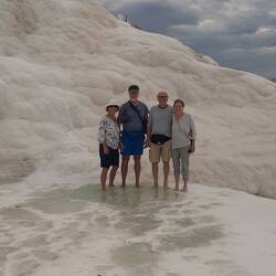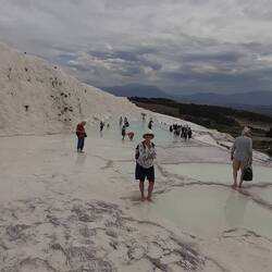 Pamukkale features magnificent white travertines with thermal water creating shapes similar to frozen waterfalls and small terrace pools.The ancient ruins of Hieropolis were built above the travertines and on top of the hot springs, and became a thermal healing center in ancient times. We climbed up, wandered around the ruins and museum, then plunged into the healing hot springs, swimming over top of some ruins. Kathie claims the thermal waters healed her finger splinter!