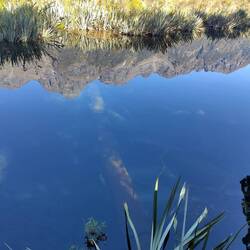 Lake Matheson, noch ein Spiegelsee. Leider hatten wir etwas Wind sodass man keine richtige Spiegelung hatte. Außer die von uns auf der Brücke.