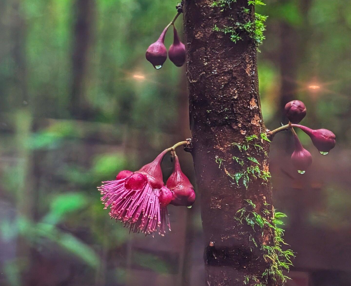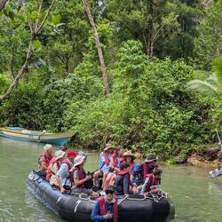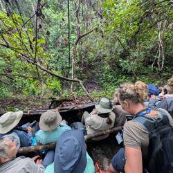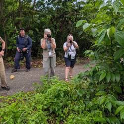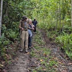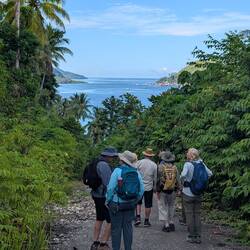Gathered ashore and jumped into a series of small SUVs for short 30 drive on some deeply rutted roads to Ceram National Park entrance. Felt very smug as found a good walking stick and tipped driver 20 for chopping it to size with his machete. Only to find 2 minutes later they were provided for everyone for free!.
