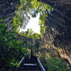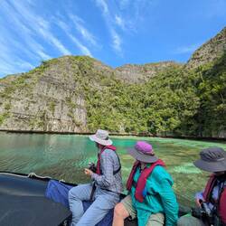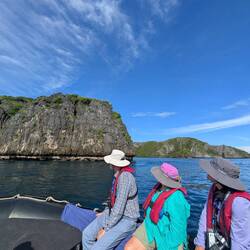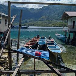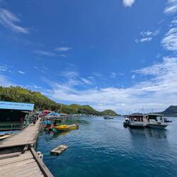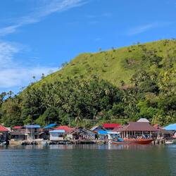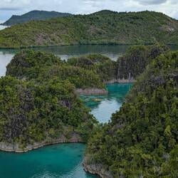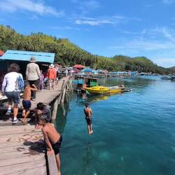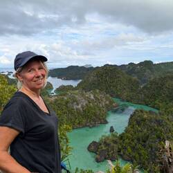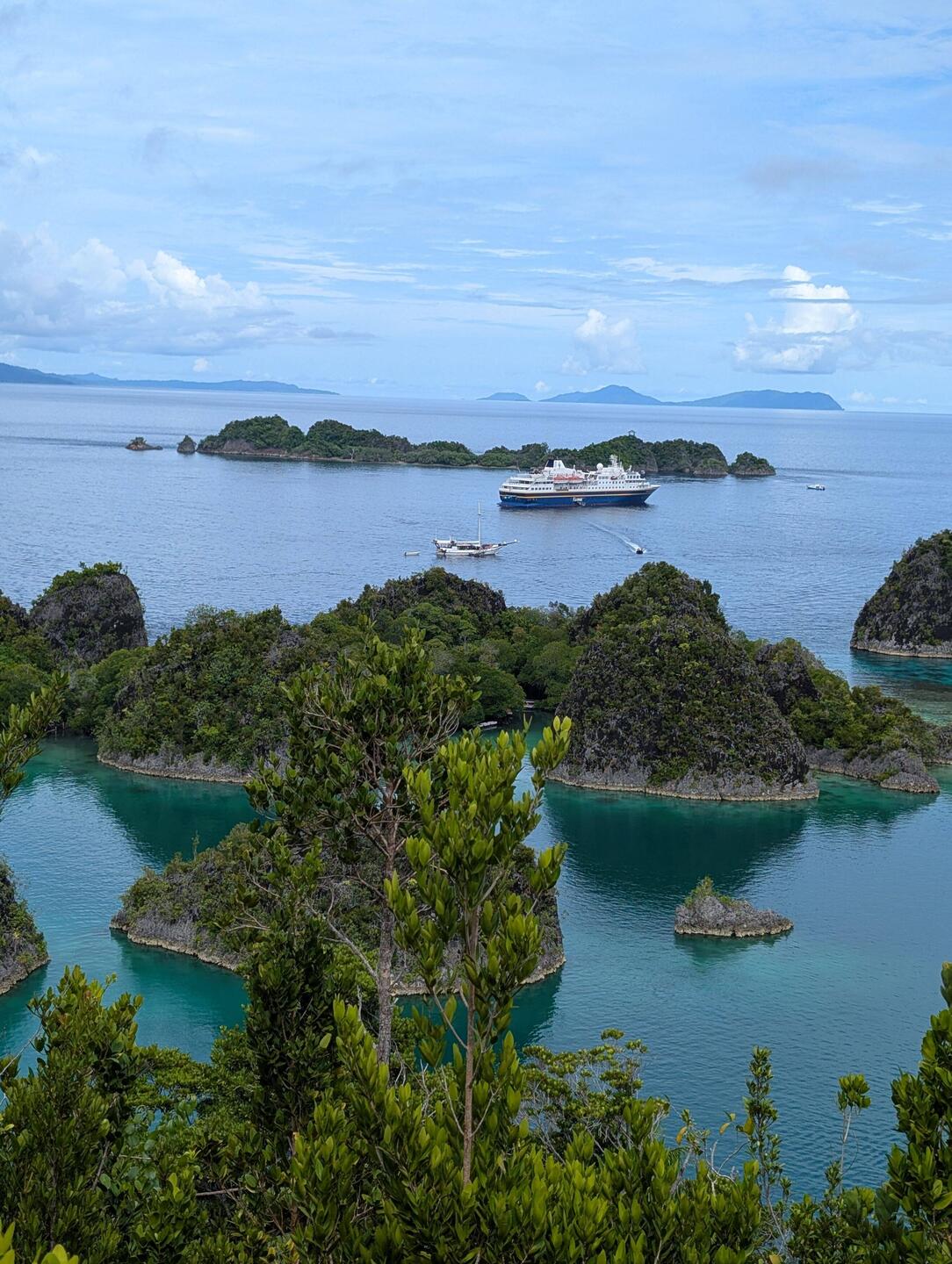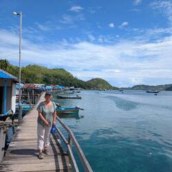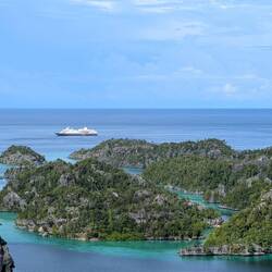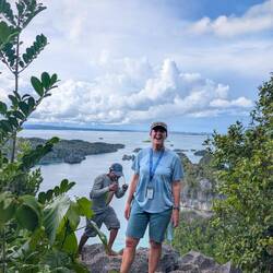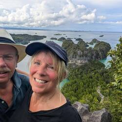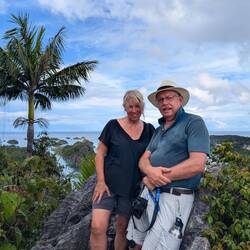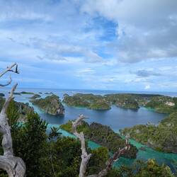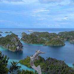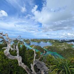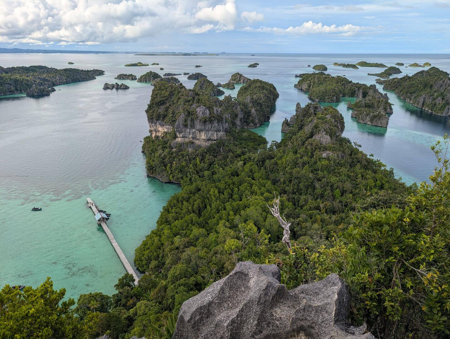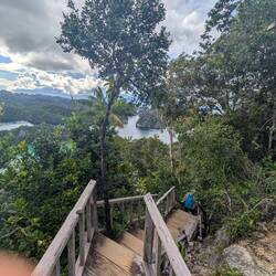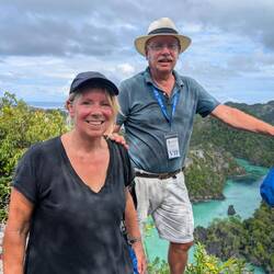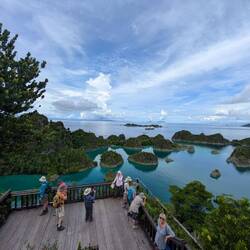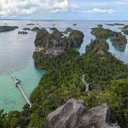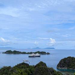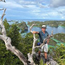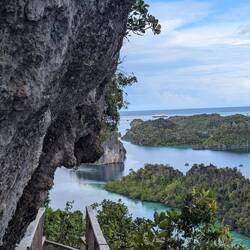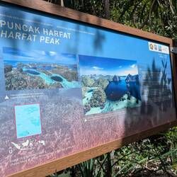 Afternoon zodiac, via a few rock paintings to jetty for Harfat peak. Spectacular views across Raja Ampat. 300 or so steps up but several missing and some big gaps. Amazed at some of the people that went, walking sticks etc , and Even more amazed that they made it up.