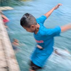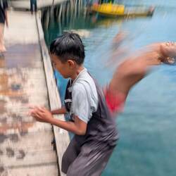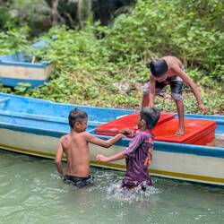 Wondered around meeting many many children and others. Highlights included 1 small boy with Chelsea shirt (Pulisic),any fine chickens, reams of kids and some adults wanting a selfie ( usually not a selfie just A photo). , , lots of fish drying, and a boardwalk along the stilt houses. Boardwalk was hugely picturesque, over the waters edge full of anemones and huge schools of small fish, past many fishing boats and a lot of fish drying, and, as ever, plenty of small boys happy to leap into the water for the camera.