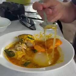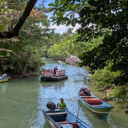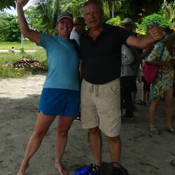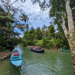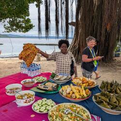 Some excellent local snacks and drinks before returning to ship. Bright pink dragon fruit drink, ginger drink, fried plantain, breadfruit, sweet potato, fish curry (with Sago goo) and some Cassava Onde Onde! Melted Pam sugar surrounded by cassava flour and coated with grated coconut. Yum.