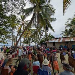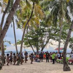 Next to the dreaded cultural dance, which was a delight. Many girls dancing, large pister on stage dedicated to Heritage Expeditions ( only ship that visits) , coconut drinks for anyone that wants, (several miserable types turned them down), and speach from village chief.