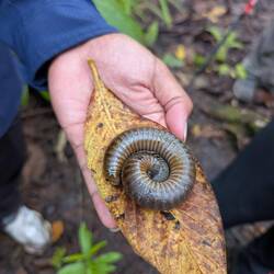 Walk back down enlivened by huge millipede. Excellent snacks, fried cassava and plantain with chilli sauce. I declined the raw chillies option.