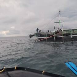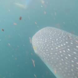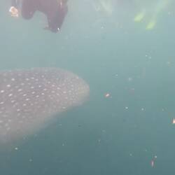 Day dawned cloudy and the sea a bit bumpy. Headed out to the Bagaan (huge fishing platform used around here) where the whale sharks gather to feed on the Small fish caught in the nets. Originally they would suck the fish from the nets but now the fishermen feed them.