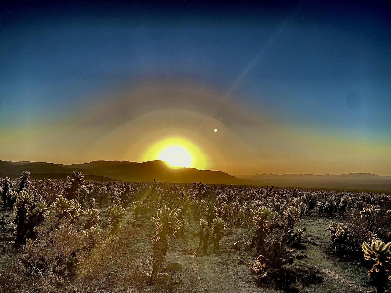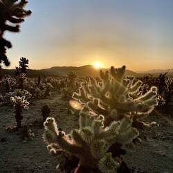 Wenn wir schon nicht im Park campten und so nur bedingt in den Genuss des Sternenhimmels kamen, so hatten wir uns zumindest vorgenommen den Sonnenaufgang im Park zu erleben. Also hurtig raus aus den Betten. FF war noch mehr oder minder im Halbschlaf machte aber keine größere Mucken und liess sich ohne Gegenwehr anziehen und ins Auto verfrachten. Von Frühstück oder einem Kaffe war um diese Zeit noch keine Rede. Stolz auf unsere - gemeinhin eher faule und morgenmuffelige- Fammilienbande fuhren wir also in den Park und zum Cholla Cactus Garden, der mit zu den Top 5 der Sunrise-Spots gehört. Es dämmerte zwar schon leicht und wir kamen in diesem bläulich-grauen Übergang von der Nacht zum Tag an, aber während der Mond noch hell leuchtete, war von der Sonne tatsächlich nichts zu sehen. So suchten wir uns einen Platz in dem riesigen Kakteenfeld und warteten auf den Moment. Um 6:03 Uhr war es dann so weit und nach ca. 20 Minuten auch schon mehr oder minder vorbei. Zumindest erschien der Aufgang der Sonne wie im Zeitraffervideo und ebenso schnell verflüchtigte sich das tatsächlich magische Morgenlicht auch wieder und das Feld wirkte einfach nur noch trocken und stachelig. Aber gelohnt hat es sich.