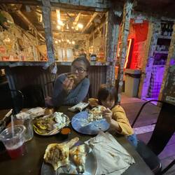 Aber wir waren ja hungrig und so ging es in den Hideout Saloon, der laut Internet familienfreundlich und gut sein sollte. Nachdem wir den Laden erstmal gefunden hatten (versteckt in einer Seitengasse und nur über einen Abstieg erreichbar, wären wir allerdings fast schon wieder gegangen. Sah der Laden doch eher nach einer sympatischen aber dann doch nach einer Spelunke aus. Eingangs ein Miss Pac Man Gerät und Billiard, der Rest eher dunkel, lediglich aufgehellt durch Dollarnoten die von hunderten Gästen teils mit grafisch nicht ganz so familienfreundlichen Nachrichten hinterlassen wurden. Also in die Innenausstattung war zumindest mal Geld geflossen. Da unsere Nachfrage, ob der Zutritt mit FF möglich sei freundlichst bejaht wurde, bestellten wir unser Essen und es war in der Tat besser als zunächst gedacht. Barfood aber frisch und von höherer Qualität als wir es mancherorts serviert bekommen hatten. Der Laden füllte sich dann auch zunehmend und es wurde lebhaft. Was anb dem später stattfindenden Karaoka-Abend lag, zu welchem man uns direkt mit einlud. Da mein Repertoire sich auf Angie von den Stones beschränkt und ich es noch nicht an die neue politische Lage in Deutschland angepasst hatten, gingen wir aber vorher. Bis zum Hotel waren es noch knapp dreissig Kilometer durch die Nacht. Schade, aber wir sollten ja noch ein paar Mal wiederkommen.