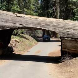 Im Anschluß die Fahrt zum und durch den Tunnel Log, einen gefällten Mammut Baum in den ein Loch geschnitten wurde, das ausreicht um mit einem großen Geländewagen hindurchzufahren. Der Baum liegt also, was vielleicht nicht ganz so beeindruckend ist wie beim zwar abgestorbenen, aber noch stehenden Chandelier Tree in der Nähe von Mendocino, aber sei’s drum. Erstens waren wir dort zumindest in der Nähe und ausserdem hätten dessen Tunnelmaße nicht für uns gereicht (knapp zwei Meter Breite und drei Meter Höhe). Und beeindruckend war es schon. Wobei am interessantesten fand ich, dass der Baum bereits in den 1930/1940er Jahren umgefallen war und noch heute stabil da liegt.