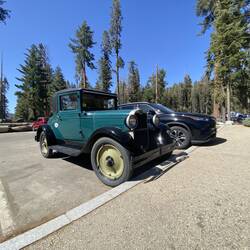 Auf dem Parkplatz begegnete uns noch eine Truppe Oldtimer, die den schönen Tag wohl auch zu einer Ausfahrt nutzten und dann ging es mal wieder auf die verzweifelte Suche nach dem richtigen Parkausgang, da wir natürlich nicht vor der Einfahrt geschaut hatten, in welche Richtung wir weiter zum Yosemite Park kommen. Die sehr grobe Karte des Lonely Planet sowie ein freundlicher Ranger halfen uns weiter und so waren wir bald schon auf dem rechten Weg.