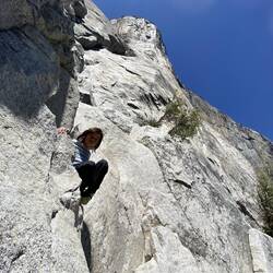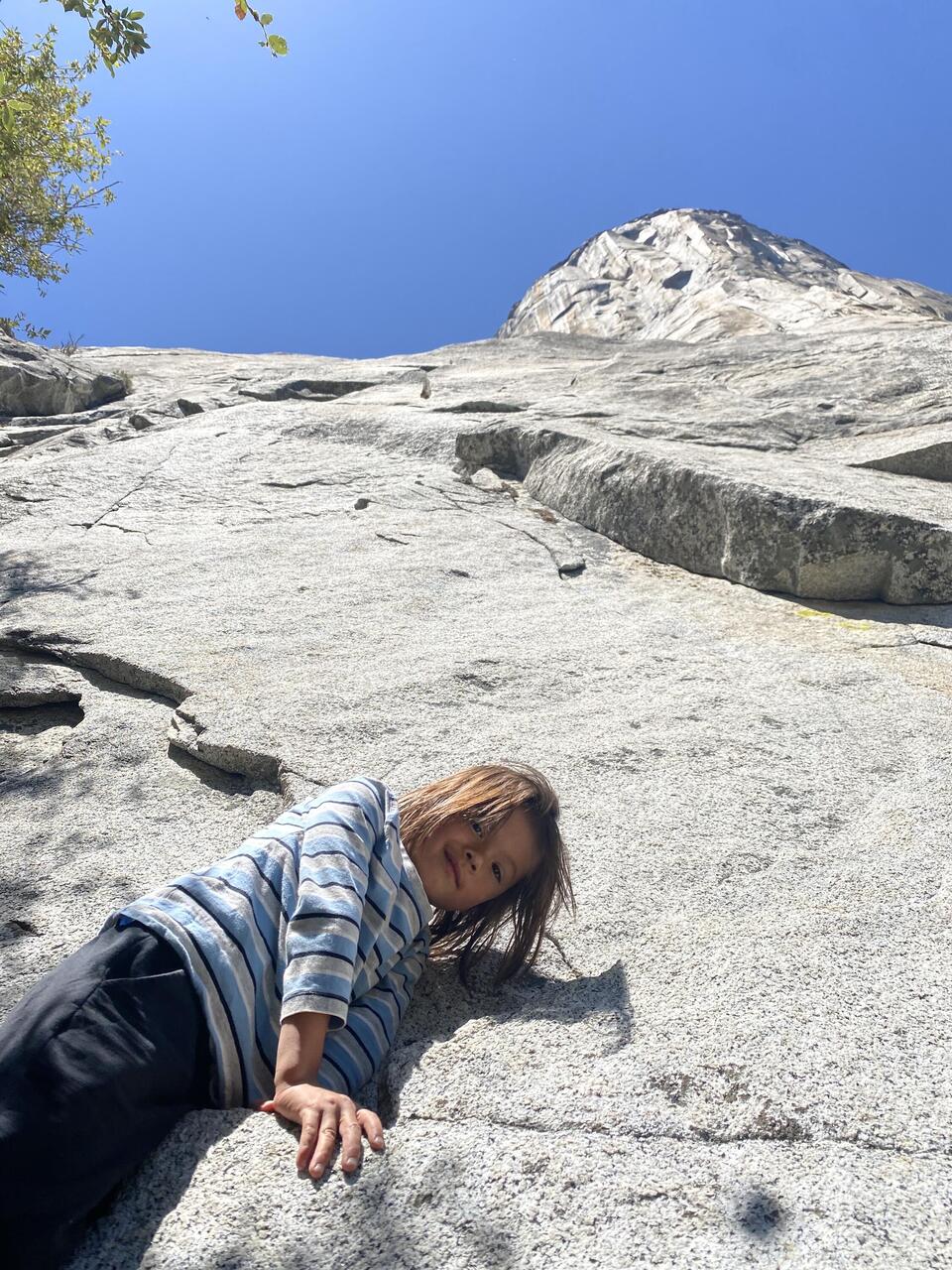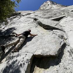 Schon auf dem Weg aus dem Park noch eine letzte Station am El Capitan. Vermutlich neben dem Half Dome das Sinnbild für ambitioniertes Sportklettern in der Welt. 1.000 Meter Steilwand, senkrecht abfallend. Der Weg zur eigentlichen Wand vermittelte schon einmal einen Eindruck, obwohl wir uns noch mehr oder minder horizontal bewegten, stand uns in der prallen Sonne schon nach wenigen 100 Metern der Schweiss auf der Stirn. Aber es muss getan werden, was getan werden muss und daher „in die Wand“. Wobei man vielleicht einräumen muss, dass der Titel dieser Geschichte vielleicht ein klein wenig (und natürlich völlig unbeabsichtigt) reißerisch formuliert ist. Denn die knapp fünf Meter, die wir uns mehr (Papa) oder weniger (FF) mühsam den Fels hinaufwuchteten, zählen natürlich in keinster Weise als Besteigung. So kletterten wir vielleicht etwas am Berg, aber nicht auf den Berg (We climbed on El Capitan, we did not climb El Capitan), aber alles Wortklauberei, stolz waren wir dennoch und damit ein weiterer und letzter Meilenstein abgehakt ehe es auf die Autobahn in Richtung San Francisco International Airport ging.