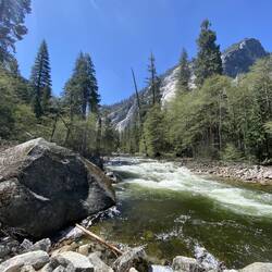 Pünktlich um 11 waren wir dann auch fertig und abfahrbereit. Erste Station: Yosemite Park zum zweiten. Statt uns zu stressen und möglichst viele Stationen abzuklappern beschränkten wir uns auf eine kleine aber entspannte Wanderung am Fluss entlang auf dem Mirror Lake Loop, wobei wir nicht die gesamten zwei Meilen wanderten und stattdessen an einer besonders lauschigen Stelle die Beine ins eiskalte Wasser stellten und uns die Sonne auf den Bauch scheinen ließen.