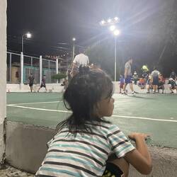 Nach dem Essen noch ein kleiner Verdauungsspaziergang hoch zum Marktplatz, wo sich die Dorfjugend einen ‚Platz zum kombinierten Fussball- und Basketball-Spiel teilte. FF saß mit großen Augen da und vermisste wohl ein ums andere Mal seine Kumpels aus der Kita um mit einzusteigen. Denn noch ist er zu zurückhaltend um sich einfach in den Pulk zu werfen. Dass für Kinder Sprachen keine wirkliche Barriere sind, mag uns Erwachsenen bewusst sein, aber für einen Sechsjährigen, der im letzten halben Jahr mehr oder minder ausschließlich auf uns fixiert war, schien diese Möglichkeit nicht real und so war er dazu verdammt das Spiel von der Außenlinie zu verfolgen.