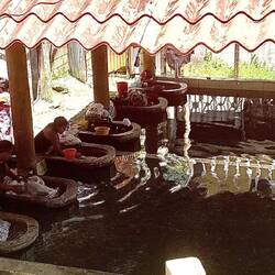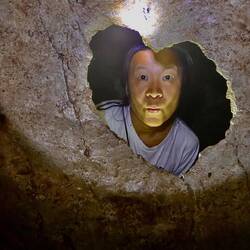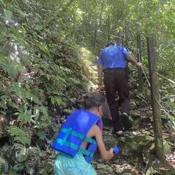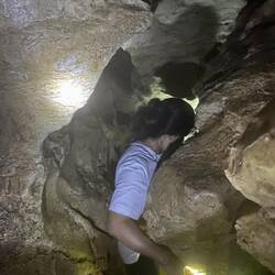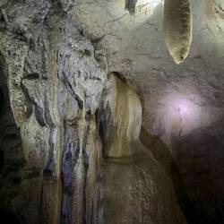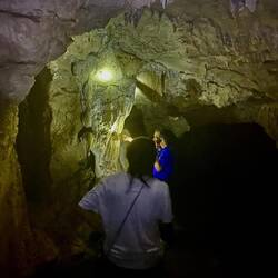 Dann ein kurzer Stop an einem leicht verfallenen Restaurant, das als Attraktion einerseits heisse Quellen hatte, die sich in einem abgetrennten Teil in den Fluss ergossen und in dem man sich in einem Wechselbad aus lauwarm bis teuflisch heiss baden und wundern konnte, ob der Geruch von den am Abend zuvor verzehrten Eiern oder wirklich von den Schwefelquellen herrührte. Aber vor der „Abkühlung“ ging es erstmal ausgestattet mit Taschenlampen und angeführt von einem älteren Herren einen kleinen Anstieg hinauf der uns nach ca. 200 Metern den Einstieg in eine Tropfsteinhöhle eröffnete. Nicht so spektakulär wie die ATM Grotte, aber dadurch, dass wir nur zu viert unterwegs waren nochmals spannend. Zudem durften wir hier fotografieren ;-)
