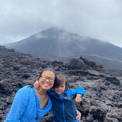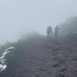 Das Wetter war trocken im Sinne von kein Regen, allerdings mit hoher Luftfeuchtigkeit, so dass uns auf halbem Weg dann doch warm wurde und ich Nancy`s Fähigkeiten bei der Beurteilung von Wanderrouten gar nicht weiter in Frage stellen mochte. Am Ziel angekommen waren wir dann auch alle einerseits nassgeschwitzt, andererseits mitten in den Wolken und schnell ausgekühlt. Daher verschwitzt in die Jacken und auf in Richtung Lavafeld. Mondartige Landschaft mit scharfkantigem schwarz-rötlichbraunem Geröll, einzelne Bereich aber auch bunt schimmernd oder schwefelig dampfend. Kurzes Maschmallow-Intermezzo zur Freude von FF und Miss I. Die Pizza, die einige Meter weiter von geschäftstüchtigen Händlern frisch aufgewärmt wurde verkniffen wir uns und dann noch schnell zum Verkaufsstand, an dem uns zwei sehr nette junge Männer über die Herstellung des von ihnen feilgebotenen Schmucks mit Lavaintarsien informierten. Das ganze teils auf Japanisch und in eine Diskussion über die Spuren des Bauhauses in Zentral- und Südamerika mündend. Ein angenehmer Schwatz also, der neben dem immer hoch zu schätzenden Austausch mit anderen Kulturen den weiteren Vorteil hatte, dass sich während wir dann doch für FF ein Armband kauften der Wind ein kurzes Wolkenfenster freilegte und uns zur Belohnung für unsere Mühen einen freien Blick auf den Vulkankraterrand und die Lavafelder gewährte. Und schon war es wieder vorbei und der Abstieg begann. Völlig unspektakulär. Ebenso wie der Lunch an einer Tankstellenraststätte auf dem Weg, mit der wahrscheinlich global austauschbaren Tirade auf die lokalen Politiker, die Steuerlast und das Leben im Allgemeinen. Wobei das Gefälle zwischen Stadt und Land vermutlich sehr viel weiter von der Gleichheit der Lebensverhältnisse entfernt ist, als wir es selbst in Deutschland zwischen Berlin-Mitte und Finsterau empfinden.