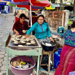 Gestärkt ging es mit dem TukTuk zu einem auf den ersten Blick ganz normalen Hausgang in dessen Flur allerdings schon eine bunte Mischung Menschen stand. Es handelte sich um den Sitz eines Schamanen, der immer für ein Jahr bestimmt wird dem Ortsheiligen Maximon Heimstätte zu gewähren und die Zeremonie der Opfergaben zu organisieren. In dem kleinen verräucherten Zimmer in dem sich in der Mitte die kleine Figur des Maximon, ausstaffiert Zigaretten und brennenden Kerzen. Der interessierte Betrachter der beigefügten Fotos wird erkennen, dass er zudem mit dutzenden abgeschnittenen Krawatten behängt war, was den Rückschluß erlaubt, dass es sich in Wirklichkeit um einen um 1796 nach Kölner handelt, der die Einheimischen nicht zum rheinischem Katholizismus missionierte sondern bei der Gelegenheit dann auch gleich den Karneval inklusive Weiberfastnachtsbrauchtum einführte. Daher war es auch nur folgerichtig, dass zu den Opfergaben neben schnödem Mamon (Katholizismus) vor allem Zigaretten und Schnaps gehörten. Unser Reiseführer war ob dieser Historienauslegung zunächst sprachlos, sagte aber zu dies in seine zukünftigen Ausführungen zumindest als eine Möglichkeit mit aufzunehmen.