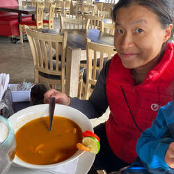 Da kam die Mittagspause in Santiago gerade recht und wir kehrten kurz in einem lokalen Restaurant zu der inzwischen schon üblichen Fischsuppe und Limonade ein. Wobei der Kelch in welchem FF sein tägliches Süßgetränkkredenzt wurde diesmal eher die Ausmaße eines Germanischen Füllhorns hatten. Ein Humpen Sirup. Aber so sind die Regeln