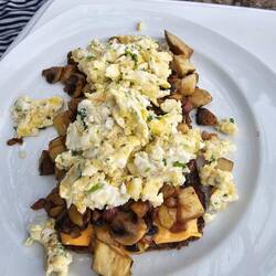 3. Brei mit Zwiebel allerlei, Spiegelei und Rotkraut