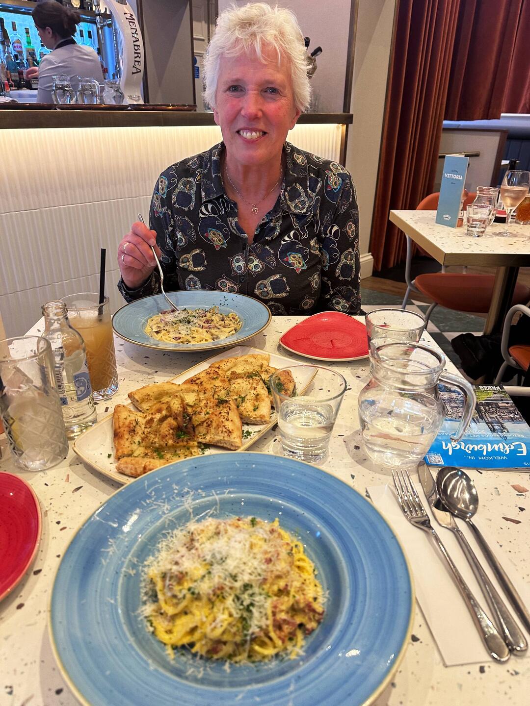 Uit eten bij Vittoria on the walk, Italiaans restaurant , lekker gegeten Spagghetti Carbonara met Focaccia. De bediening werd verzorgd door Edo & Kasia.