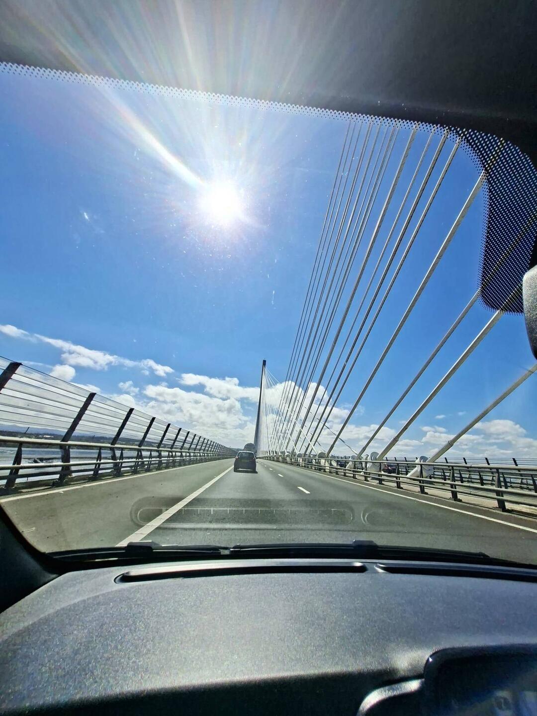 Na de koffie en soep vervolgen we onze route, even later passeren we de Queensferry Crossing.
