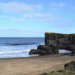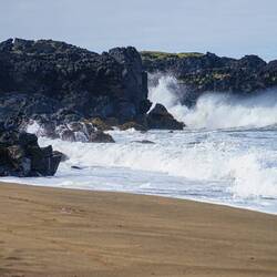 We continue our drive and pass Hellissandur where we stop in a grocery store to buy some lunch. From here it's not much further to the peninsula's top and another landmark: Skarðsvík. We decide to have lunch there. About this time, we enter the Snæfellsjökull National Park. At the end of the peninsula there is a huge volcano where the top is cover by a glacier. It's so big that on a clear day you can see Snæfellsjökull from Reykjavik! The main road takes us around the volcano. But first, a tiny windy road leads to Skarðsvík: a small yellow sand beach. Yes, you read that well: yellow sand beach. It's one of the few places in Iceland where you can see find sand that isn't black. We have lunch at a picknick table and enjoy the waves crashing into the rocks on either side of the sand. We're so lucky that the sun is shining on this last busy day.