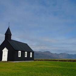 We follow the main road and make a stop at Hellnar. This is a tiny settlement that offers great views on the cliffs. There's also a famous walk between the town of Hellnar and Arnarstapi. But because the walk is about 4km one way, we would lose quite a lot of time with a round trip. Most of the pictures we've seen online show the same jagged coastline. We get out of the car and have a quick look around. Walk a few metres onto the trail but then turn back and continue our trip. Next up is the famous black church of Búðir. Again one of Iceland's most photographed icons: the black wooden church in the middle of nowhere. It's located next to a lava field and a few metres apart from an old hotel. With the sun, this makes the classic guidebook picture. We make a short walk in the lava field before heading back to the car. Most of the lava is covered by grass or moss yet one has to be careful where to tread. There are cracks in the earth or depressions in between the lava structures.
