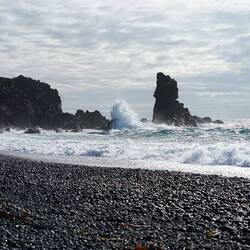 As we enter the black marble beach, we can spot the rusty remains of the Epine GY7. A fishermen boat that stranded and crashed on the rocks before the coast in March 1948. Sadly, 14 of the crew drowned. The remains washed ashore and have remained there unspoiled ever since. Just like the DC3 plane wreck at the beginning of our journey, I'm amazed by how they leave these things untouched in nature. Honestly, it connects way more this way than being in a museum or completely forgotten. At the shoreline we can understand why the sea around this part of the island is notorious. The waves crash into the black rocks and with the sun right in front of us provide really great photos for silhouette photography. We spend a couple of minutes here soaking in the beautiful landscape.