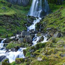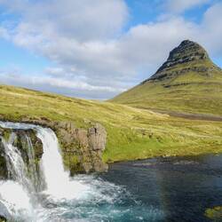 50m from the parking lot, there is a bunch of people taking the famous picture. Today is especially good because of the beautiful weather. Lots of people with tripods and camera filters. All looking to get that one amazing shot. And yes of course... so are we. Nevertheless, we didn't bring the tripod and are happy with a few decent shots. The mountain is impressive, and it surely makes a beautiful picture. Although, somehow on picture it looks more surreal. While standing there, the Kirkjufell mountain actually gets easily lost in between all the other mountains. The view behind us is honestly also a very impressive sight: green cliffs with waterfalls coming down. It truly is an amazing country!