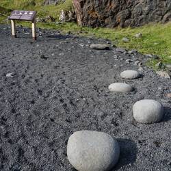 From one beach to another. On the southern tip of the peninsula, we find Djúpalónssandur. Also a famous beach, but this time it's back to black marbles. Apart from the stunning beach, there's a lot to see here. According to old folk tale the fishermen measured the strength of the men who wanted to join their ships by lifting certain stones. There are 4 stones: "Fullsterkur" (full power) with a total weight of 154 kg, "Hálfsterkur" (half power) of about 100 kg, "Hálfdrættingur" (weakling) of 54 kg and "Amlóði" (useless) of 23 kg. Unfortunately, the smallest one of 23kg has gotten lost. If you could lift "Hálfdrættingur" to the height of your hip, you were allowed to enter the ship.