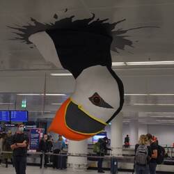 At around 3PM local time we set foot on Icelandic soil and quickly arrive in the baggage reclaim area where we are welcomed by a huge puffin breaching through the ceiling. A true icon of Iceland! Rightfully so, as Iceland hosts the biggest colony of Atlantic puffins in the world. Unfortunately we won't be able to see these cute birds as breeding season has already ended and they have flown south for the winter.
