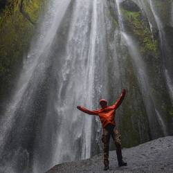From the same parking you can make a small hike (less than 2km) to another waterfall: Gljúfrafoss. This one is located in a small canyon and at first we're not completely sure which path leads to the waterfall. As none of the paths is very long, we follow the tourists in front. As the path gets smaller it turns out that... no, dead end. We head back and take the next path that follows a creek coming out of a canyon. By this time we can hear the waterfall. This must be the right way! Staying close to the canyon wall not to step into the creek we arrive at waterfall. In front is a huge stone that makes the perfect photo spot. Because little light reaches the waterfall through the canyon, taking pictures is a challenge.