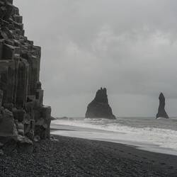 We take pictures of the wild waves crashing ashore not far from the basalt columns that are rising up at the bottom of a mountain. Being warned about the danger of this beach we have one eye looking through the camera's viewfinder, and the other on the shoreline. And not in vain, because every now and then we have to run further inland to prevent our feet getting wet.
