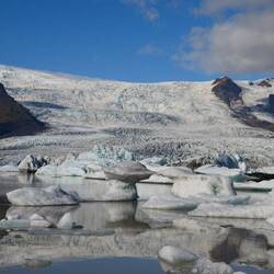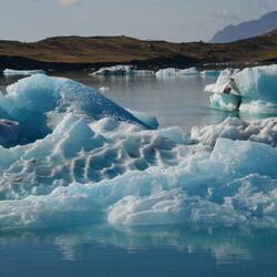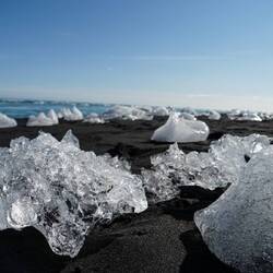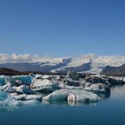 Not much further lays the most famous glacier lake of the country: Jökulsárlón. With a surface of 15km² it's a huge lake full of icebergs drifting away from the glacier itself. The dark blue water gives great contrast with the white and light blue glue of the ice. The lake is connected to the sea through a river where big pieces of ice end up in the ocean. At the seashore there are lots of these smaller pieces of ice that wash ashore and make another famous picturesque sight: diamond beach.