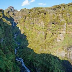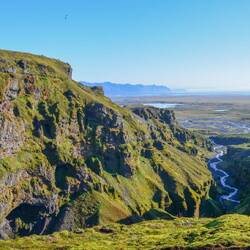 While reading the guidebooks in order to prepare for our trip, I read something about a beautiful hike to Hangandifoss. There was little information to be found on where the waterfall was exactly located. Nevertheless, the few lines that I found promised a spectacular walk to one of Iceland's highest waterfalls. Especially when visibility is good. As today seemed the perfect day for such a hike, we carefully looked up the coordinates for the start of the gravel road that should take us there. After a short drive we park our car at the end of the track in a slightly wider area. There's one other car, so we're at least not the only ones who found out about this trail. Even as we get out of the car, we're already blown away by the view of the gigantic glacier not too far away. Yesterday we couldn't see any of this, today all the ice on the mountain tops is clearly visible. As we continue our climb uphill, we often look back to see the glacier and the sea. After crossing a little river it's one climb to the top alongside a deep gorge. We can see the goal of our trip in the distance; a long and small waterfall that falls down inside the gorge. Along the way we take many many pictures of the variety of views that the landscape offers us. The seagulls inside the gorge provide great contrast as to how huge this canyon is.