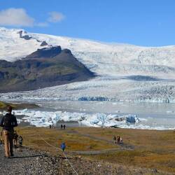 After parking the car and walking a short path to the lake we are now standing right at the end of the glacier. The size of it and floating pieces of loose ice are breathtaking. For both of us, it's the first time we can get so close to the glacier itself. The beach provides great photo opportunities. By now we already realize that selecting photos at the end of our journey will be a very difficult and time consuming job.