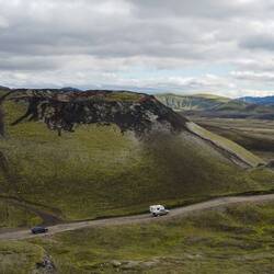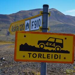At last we leave the ring road and turn on road 26. New, undiscovered, ground that will take us further inland. This road turns after a while in the F26 which we will drive all the way to Mývatn on the next day. All F-roads in Iceland are off-road tracks and require a 4-wheel drive car. Just before the asphalt stops, we turn right onto the F225, our first F-road. We quickly read the signs sayings that 4x4-cars are mandatory and that there are possible river crossings on these roads. The speed limit is reduced from 90 km/h to 80 km/h on these roads, but 60 km/h is often recommended. It doesn't take long before the landscape around us has changed completely. From the fields and pastures we've seen around us into the black sand and green hills. The road is generally a single lane track so when encountering opposite traffic you need to be creative to pass each other or wait in a wider area.