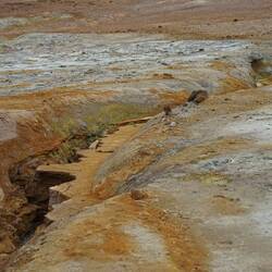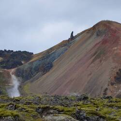 The trail begins with a lava field. The road winds through the sharp rock structures and every now and then provides a view with colourful hills. Not that much later we arrive at the end of the maze and at the foot of a hill with steam coming out of the earth at different locations. When getting closer to one of these steam holes, the smell of sulphur becomes more intense. As we circle back for a short while, the trail suddenly takes us into another valley. Now we're really in between the hills and we're blown away by its beauty. It is unbelievable how nature can create these places on earth.