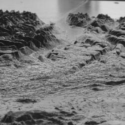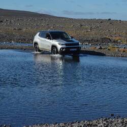With the trailing cars in the rear-view mirror, we notice our mistake... this was only a first flooded area to cross. Up ahead is a way deeper and wider area to cross. Ann gets out of the car and inspects the danger ahead. By what I make of her body language and hand gestures I believe this second part is equally do-able as the first part. Slightly pressed by the cars behind, I continue and follow the path Ann has explored: first a turn to the right to get to the edge of the pool. Just before the pool's edge, she makes clear that I cannot go there. Because stopping is one of the things you really shouldn't do when crossing water on loose stones, I decide to give the car a whirl to the left and cross at the point where we currently are. The car takes a dip with the nose in the water and rather clumsy I end up at the other side of the pool. The cars behind me have seen enough and decide to take a different approach on this (rightfully so). The car behind me with slightly higher clearance decides to go straight through. He makes it across looking less like an idiot, but I'm also not entirely convinced as the water did rise to his ventilation panel. For us that would have come even higher. We both get back in the car and drive to the parking lot. Just before we arrive, we smell a burned odour. We quickly park the car and turn it off. Hoping it will all be dry again after our walk. That dip the car made, was slightly above the maximum wading depth for our car... We hope we'll find a working car when we return.