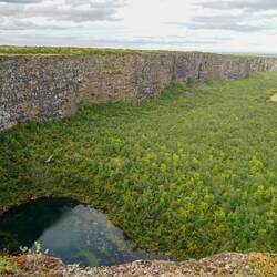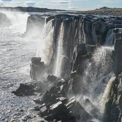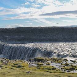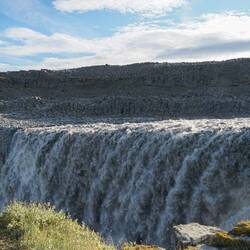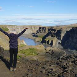 The track is sometimes hard to find and winds at times very close to the gorge's edge. The reason for this becomes instantly clear: a massive waterfall goes down into the gorge. The cloud of mist we could see from the other side is from this waterfall. Maybe it was because of the wind, or the distance from the edge, but we didn't hear the crashing water that well from the other side. According to guidebooks this is the second highest waterfall of Iceland.