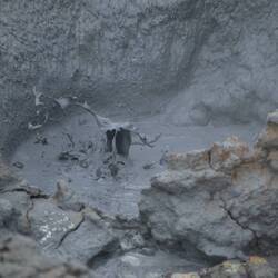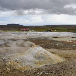 When arriving at the approximate location we didn't see any sign or indication of the geyser. By this time, it started raining heavily and Ann decided to jump out of the car and take a short walk (or run) over a hill to see if it was maybe at the other side. Meanwhile I kept searching on my mobile to find the exact location. By the time Ann returned we found out that the geyser was actually right next to us. A subtle circle of stones gave the hole in the ground away. No other tourists and no activity, just a hole in the ground. Not a huge success for our first stop.