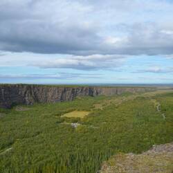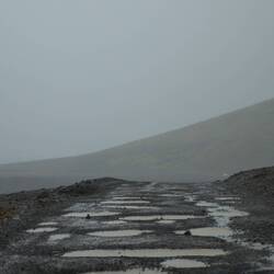 When we're approaching the highest point, we're exposed to a strong wind. We zip-up our jackets and put on our hoods and press on. In front of us there's a deep gorge, just before, the path takes a left turn and follows along the gorge. We can't see very well into the gorge itself because we can't get close enough to the edge. Every now and then there's a cloud of mist that emerges from the depths.