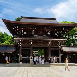 Meiji Shrine itself is also very spectacular. Large wooden gates and buildings and huge tori gates to welcome you to the shrine grounds. We can see a little part of a ceremony that's being held and stroll around some sacred trees that have many wooden plaques hanging around it with people's wishes or gratitude.