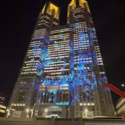 When we're back on the street, we notice a group of people watching something on a square nearby. There's music as well, so we decide to make a brief stop. On one of the sides of the skyscraper, there's an immense light spectacle. The music fitted so well with the experience. Very nice to watch!