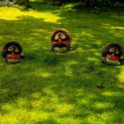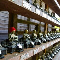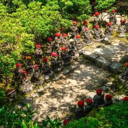 When leaving the temple grounds, there's an alternative path next to the stairs with the sutras that takes us along hundreds of tiny statues. Almost each and single one of them is wearing a red knitted hat.
