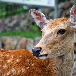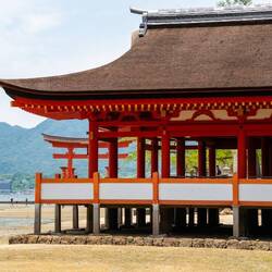 To our surprise, Miyajima also has deer wandering around. They're not as social as the ones in Nara, but some of them are starting to understand that people quite often equal food. The sidewalk next to the coast takes us to the Itsukushima shrine which is the shrine complex of which the torii gate is actually part of. We pay our entry fee and walk around the many wooden boardwalks on stilts. When it's high tide, the water reaches all the way up to the main complex. At this very moment, the torii gate is about 300m away and entirely dry. After our visit in the main shrine complex, we don't walk all the way up to the gate itself as we're under the impression that the nicest views are probably from where we're standing.